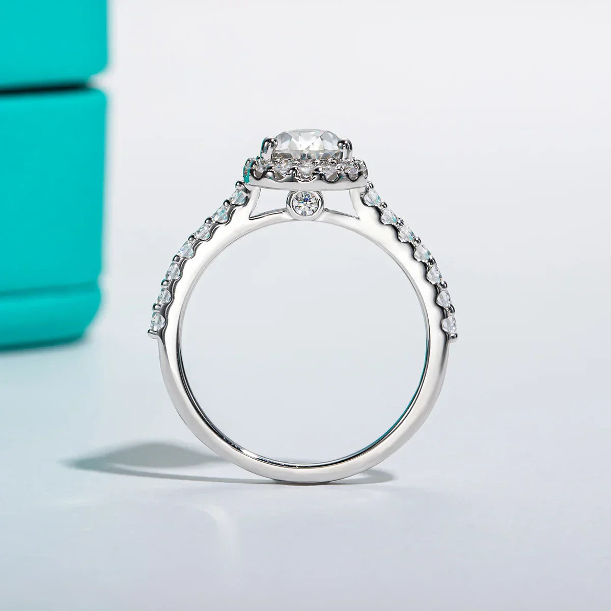 - Halo Setting: A sparkling halo of smaller stones surrounds the center moissanite, enhancing its radiant glow and giving the ring an extra touch of glamour.