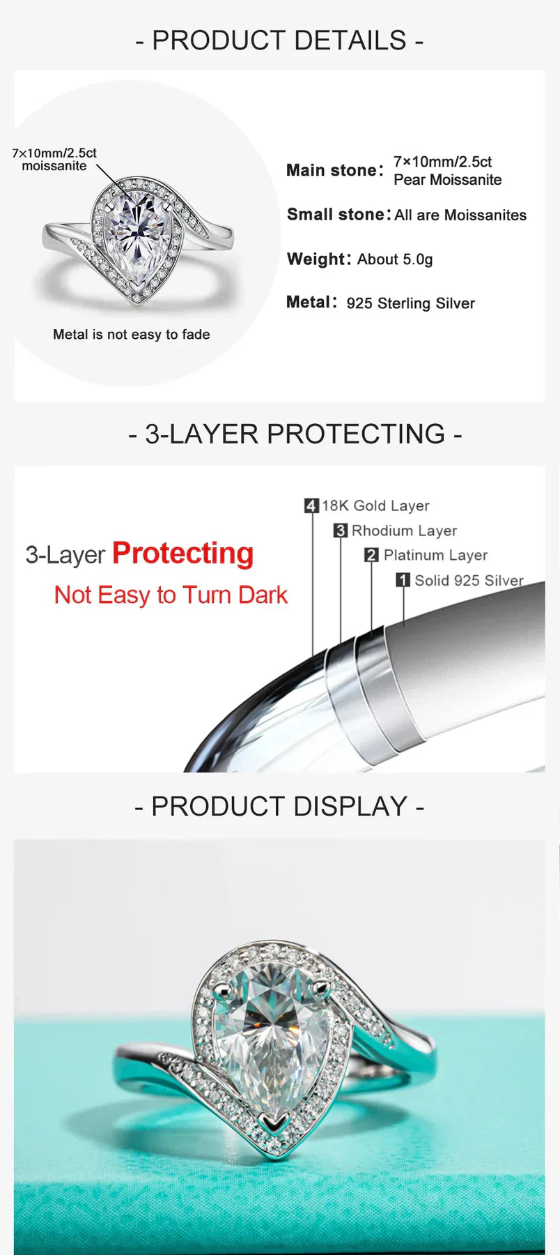 - 2.5 CT Pear Moissanite: The striking pear-shaped center stone radiates brilliance and elegance, capturing attention from every angle.