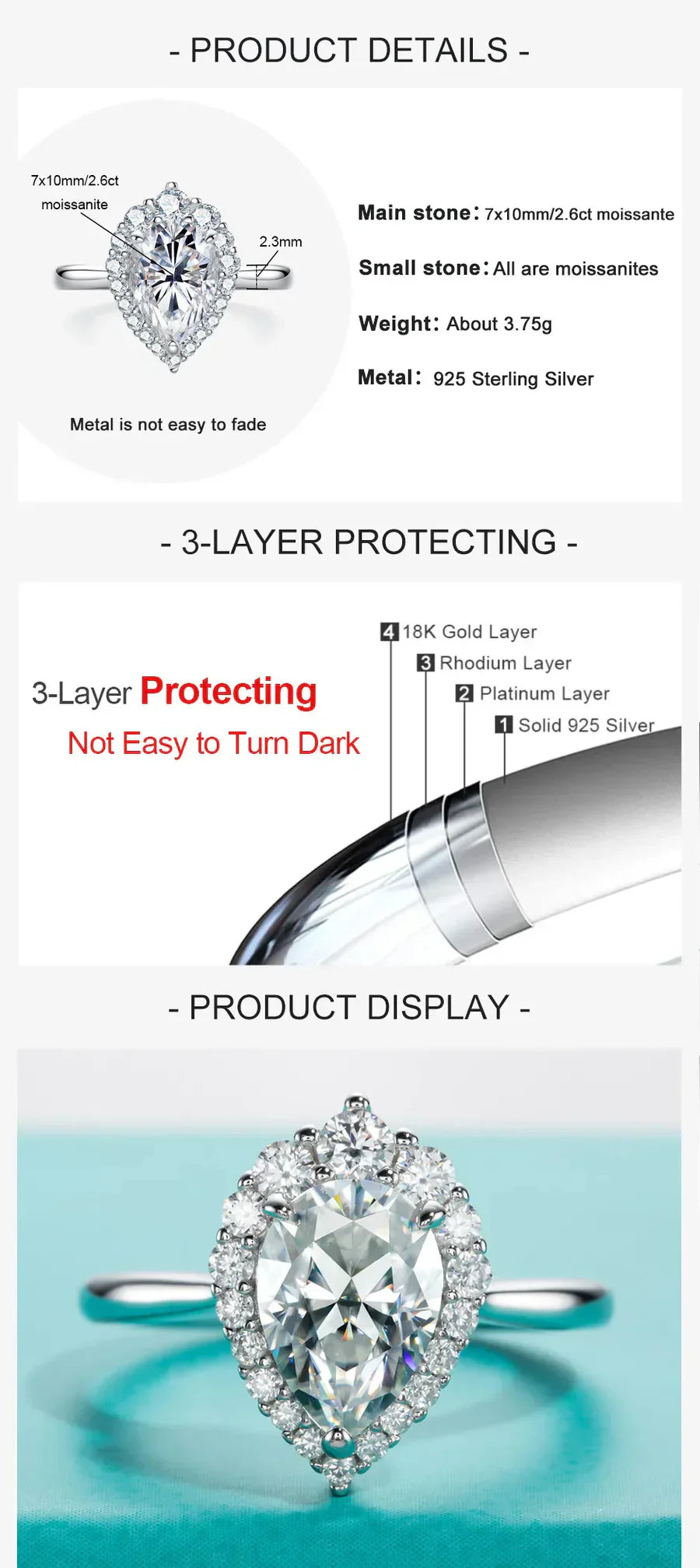 - 2.6ct Pear Cut Moissanite: A breathtaking pear-shaped moissanite stone that radiates brilliance with its unique teardrop design.