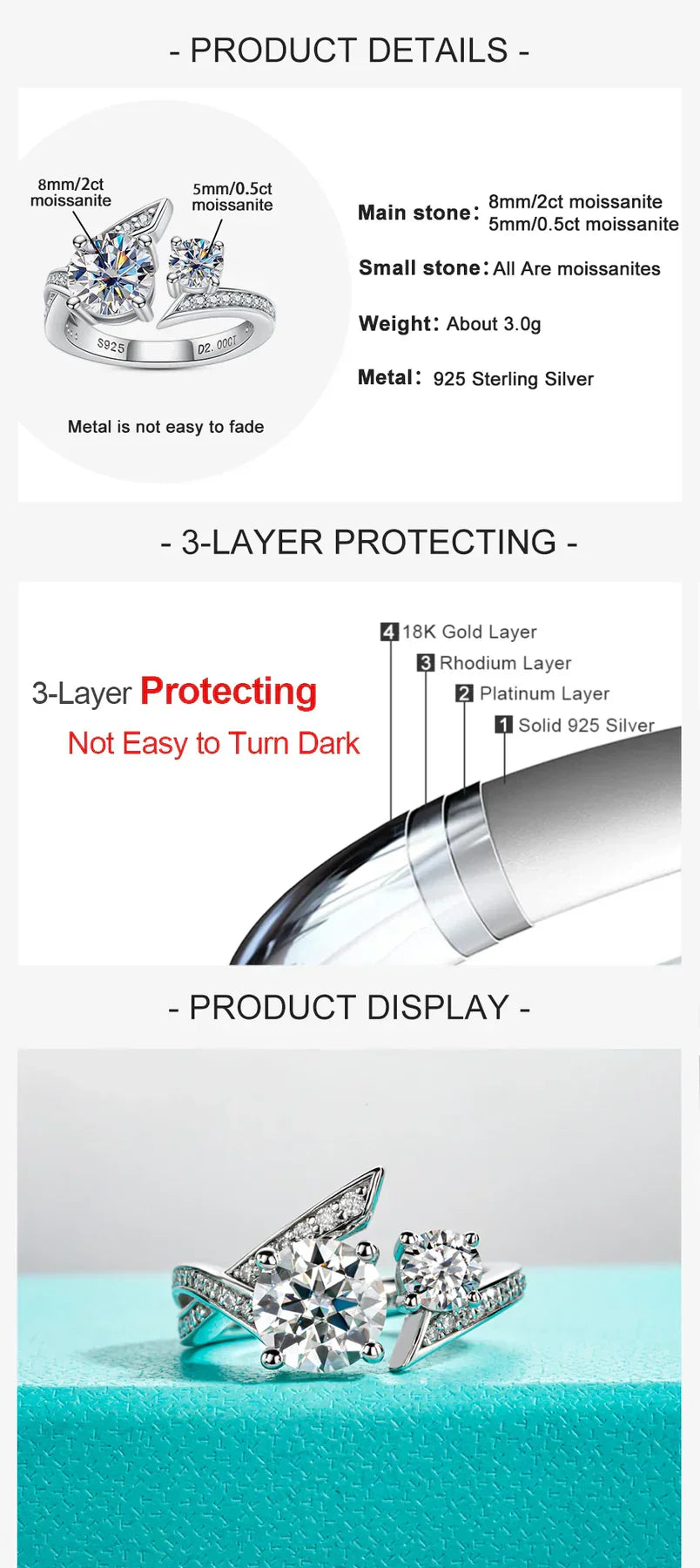 - 2 Carat Moissanite: Featuring a brilliant 2-carat Moissanite stone that sparkles with diamond-like brilliance and clarity.