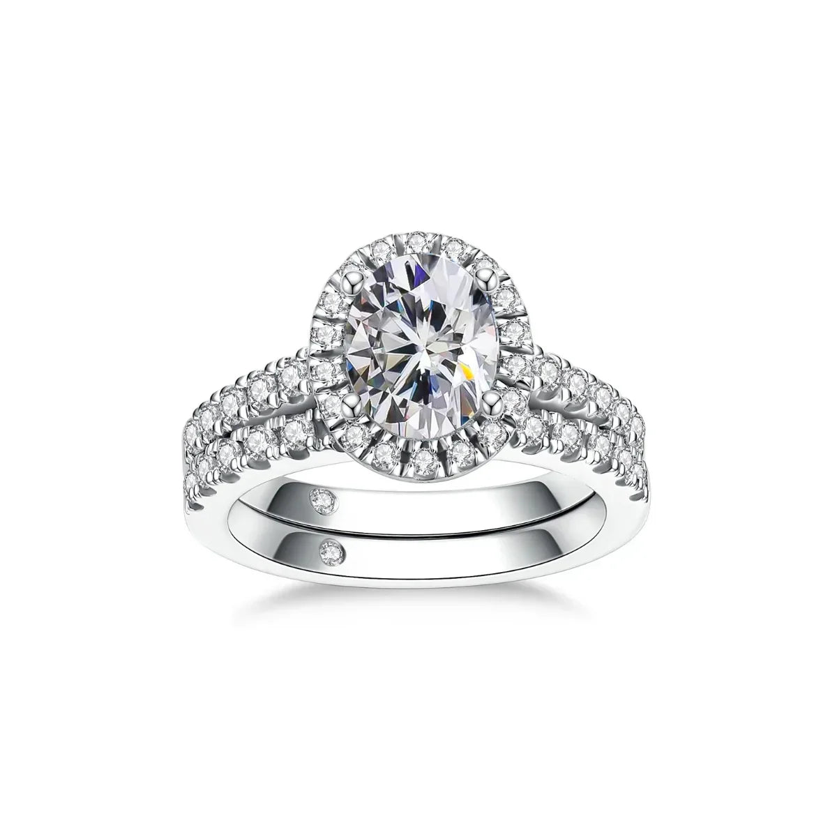 - 2 CT Oval Cut Moissanite: The centerpiece of this set is a dazzling 2-carat oval cut moissanite, known for its elongated shape that enhances brilliance and creates an elegant, sophisticated look.