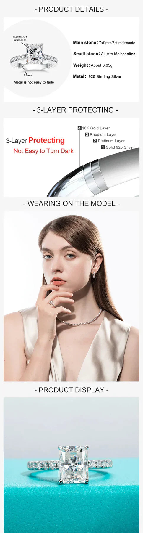 - 3 Carat Radiant Cut Moissanite: The captivating radiant cut maximizes sparkle and brilliance, providing a dazzling centerpiece for your engagement ring.